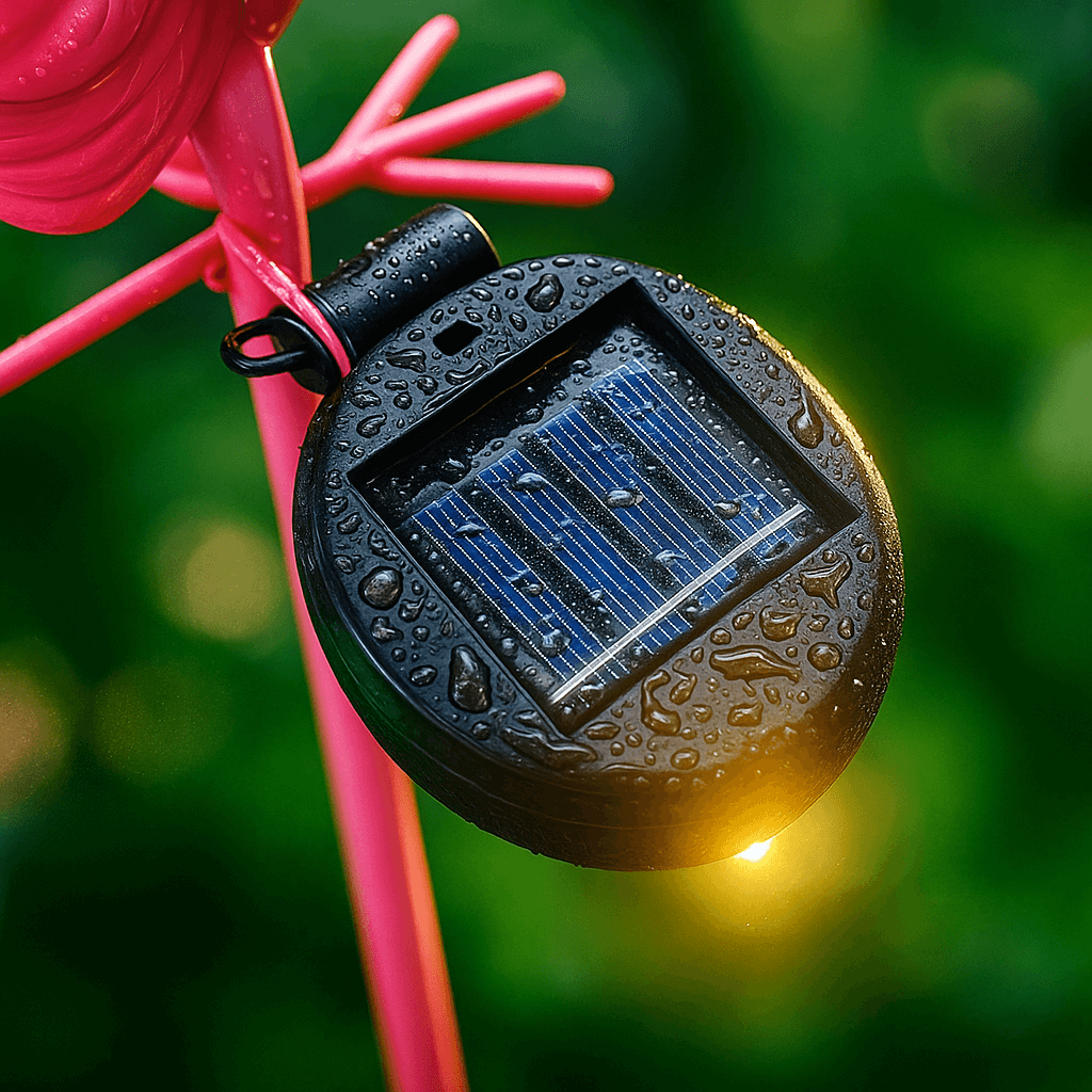 • Solar panel: Integrated next to the flamingo, charges the lamp