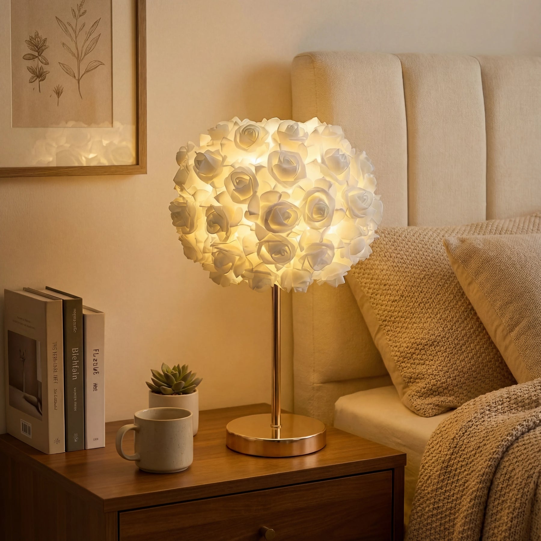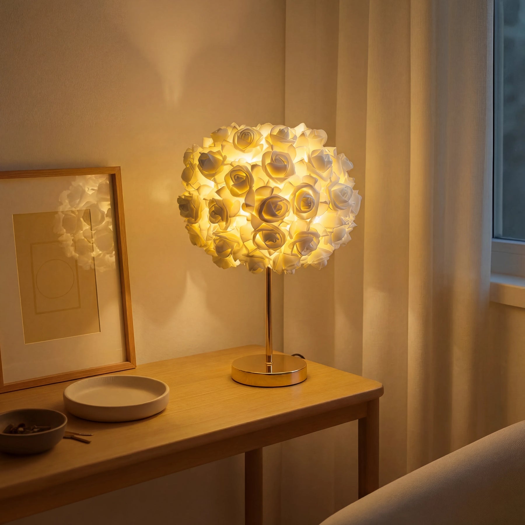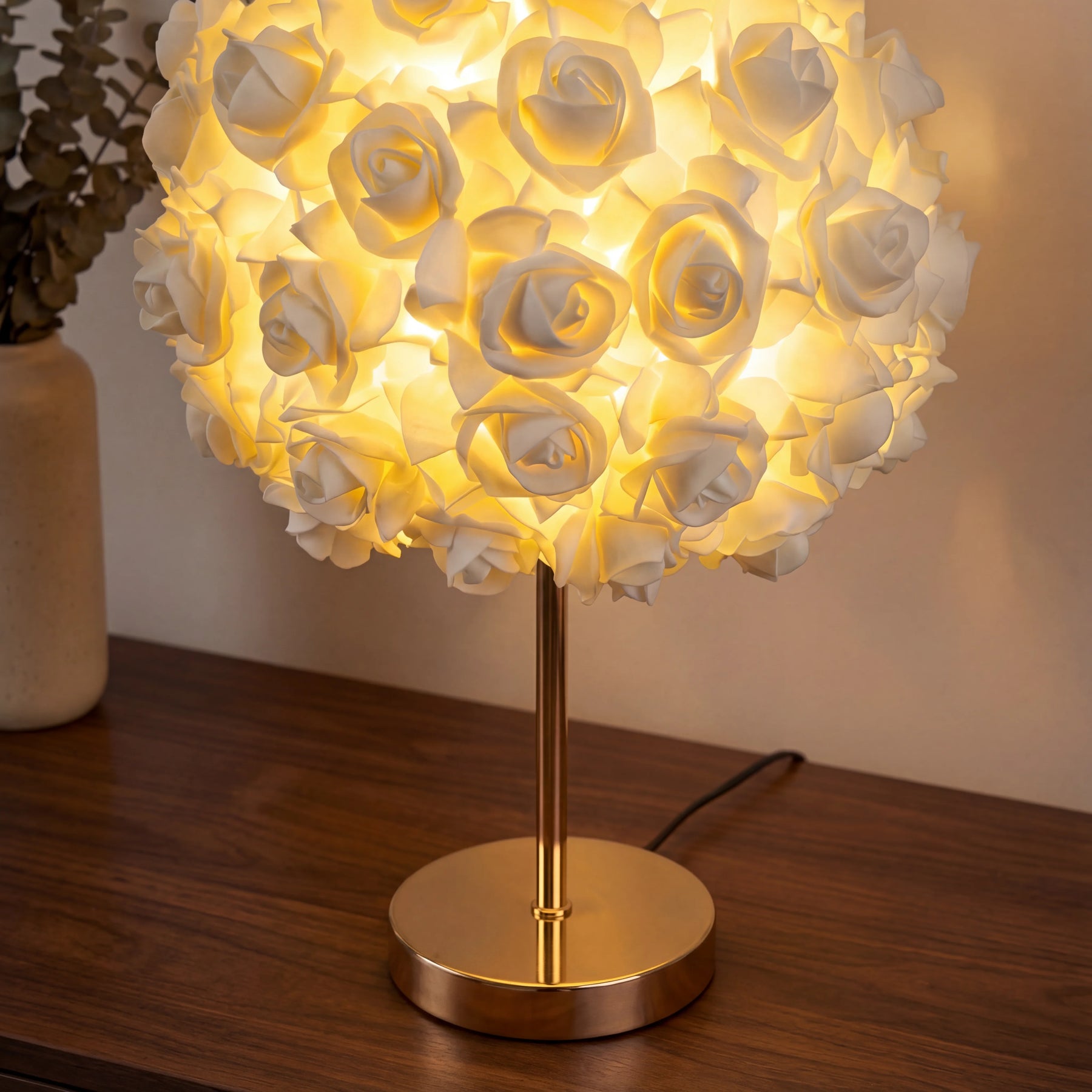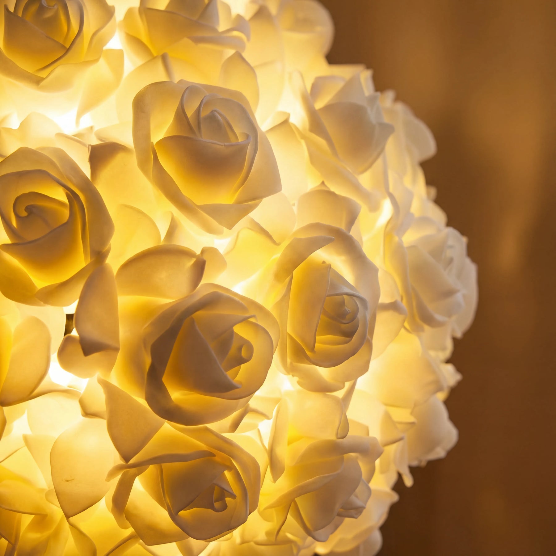 The lamp consists of dozens of beautifully designed roses that glow softly, creating a luxurious and dreamy ambiance.