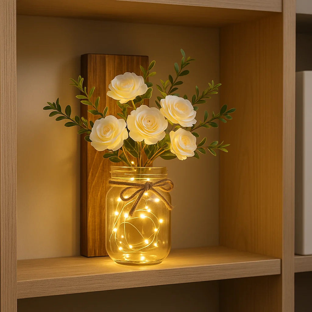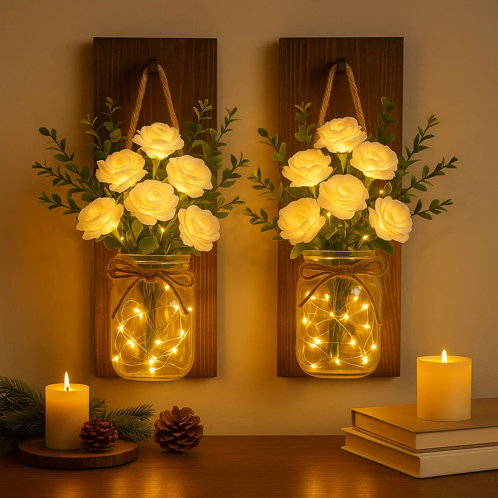 • Material: Solid wood (shelf), Plastic (flowers), Glass (Mason Jars)